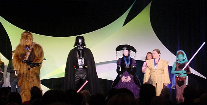Costuming is a large and growing part of the Star Wars Celebration events. Just walking around it's impossible to miss the hundreds of detailed, unique and inspirational costumes made and worn by fans. Most do it for fun, but when many hours of research and work go in to a hobby, there is inevitably an element of good-natured competitiveness...the Celebration Costume Pageants cater to this and allow people to get up on stage to show off their creations. Increased popularity, amongst both the audience and entrants, meant that 2 pageants and a parade (the latter with no judging/prizes) were run in order to expand the showcasing of costumes. Not everyone necessarily agreed with the judges decisions in each of the pageants, but an audience-judged round at the conclusion of the pageant determined the overall winner...in the second stage-show, it was satisfying and appropriate to see that Chewbacca can receive a congratulory medal if the competition adjudicator reaches up carefully enough. A meticulously crafted and impressively tall Wookiee took away the best-in-show award for the second day event.
