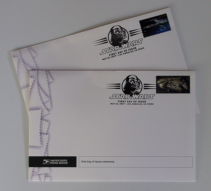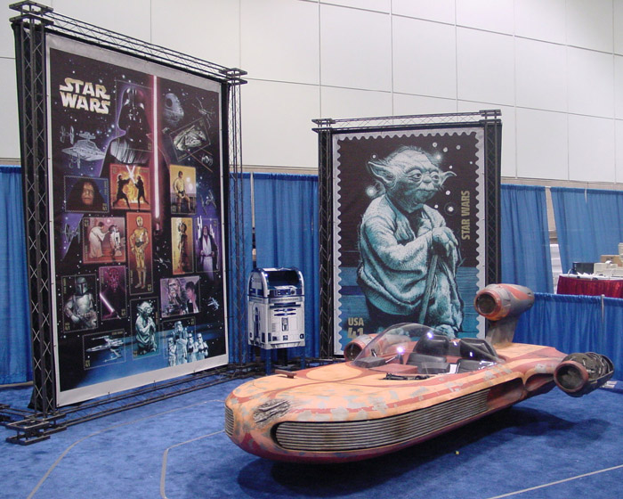 In conclusion, and as an appendix to the report covering the Opening Ceremonies, I've included a few pictures relating to the Star Wars USPS stamps. As most are aware, the Star Wars 41c stamps are available in the United States on a sheet of 15. Jedi Master Yoda won the popularity vote to become the only one of those 15 to be released individually. In a very convenient move, USPS had shops within the convention centre to both allow people to ship straight home their many convention purchases, but also to make available the Star Wars stamps and associated merchandise. Amongst the philatelic collectibles were first day covers, which were actually given out to all attendees of the Celebration Opening Ceremony, and which contained a programme for that evening's schedule - it is very cool that they bear the date of release which is also the 30th anniversary of the Los Angeles/United States Star Wars premiere.