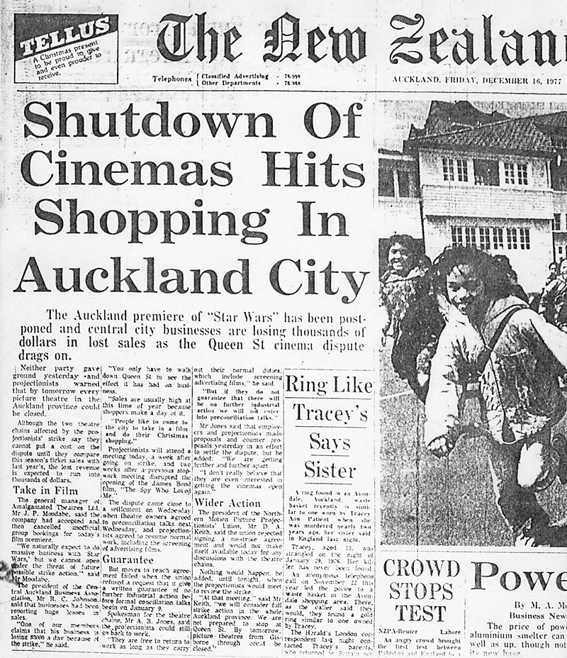 There was more to the story behind this Star Wars premiere however - it was originally scheduled for about a week prior. The hold-up was due to the fact that the projectionists of the main theatre chains were on strike at the time. In fact, the delay of the Star Wars screening made headline news on 16 December, 1977 (newspaper scan). That story read: "Shutdown of cinemas hits shopping in Auckland city. The Auckland premiere of 'Star Wars' has been postponed and central city businesses are losing thousands of dollars in lost sales as the Queen St cinema dispute drags on...The general manager of Amalgamated Theatres Ltd, Mr JP Moodabe, said that the company had accepted and then cancelled unofficial group bookings for today's film premiere.