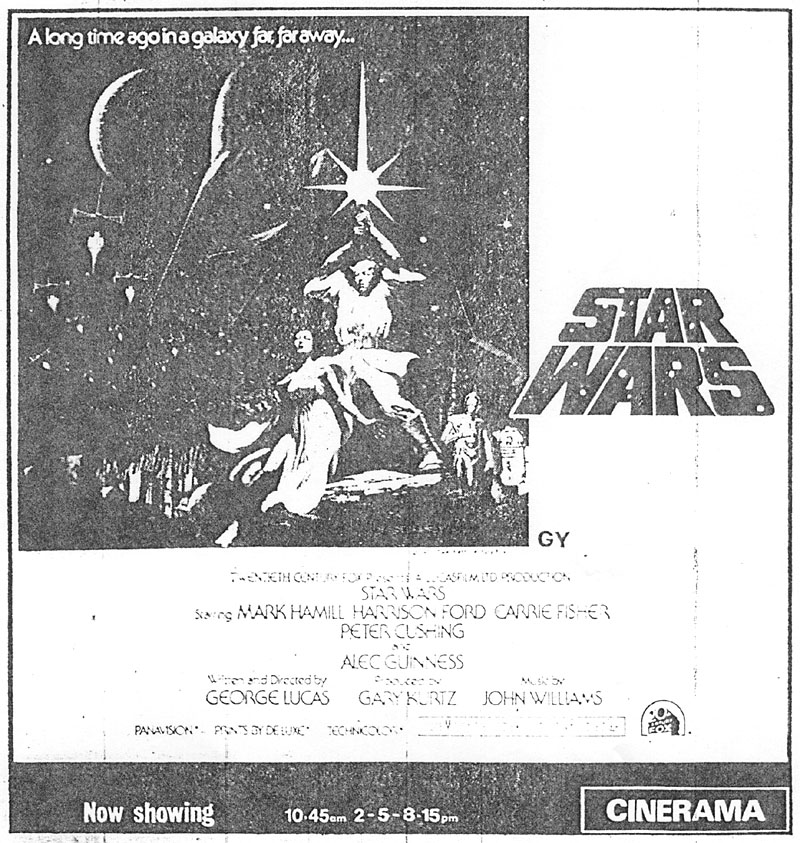 When did Star Wars first screen in New Zealand? It's a question that I've heard a few times now, so I decided to undertake some research in the Auckland Library microfiche archives to verify my memory of the premiere. For the Auckland region (and upper north island), the first opportunity to see it was on Christmas eve of 1977, at the Cinerama theatre in Queen Street, Auckland (newspaper scan). Almost 7 months after its USA debut! This was before the time of multiplex cinemas...only one screen was showing Star Wars, with 4 shows daily: 10.45am, 2pm, 5pm and 8.15pm. The booking details for the listing read: "Feature occupies entire programme. Book at theatre only. No phone reserves. 8.15pm reserves 6 days ahead [!!] Tomorrow's 10.45pm session tickets on sale at Theatre from 3pm today".