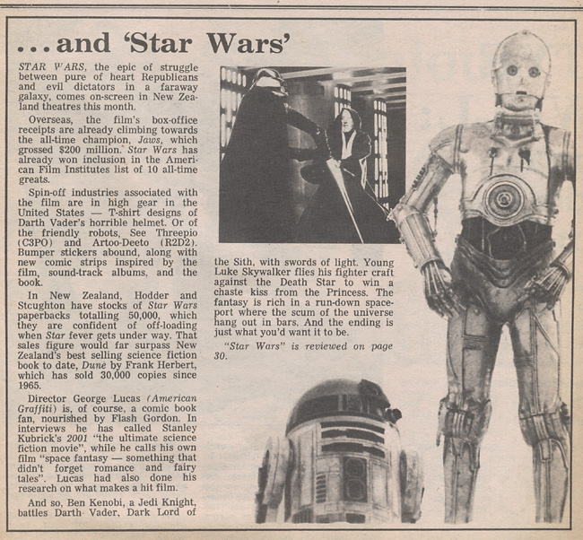 Also discussed is the leading edge of the merchandising phenomenon that has now lasted over 3 decades: "In New Zealand, Hodder & Stoughton have stocks of Star Wars paperbacks totaling 50,000, which they are confident of off-loading when Star fever gets under way. That sales figure would far surpass New Zealand's best selling science fiction book to date, Dune by Frank Herbert, which has sold 30,000 copies since 1965."