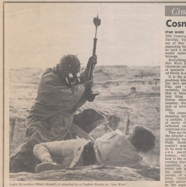 Separately, in the cinema section, the Listener's reviewer critiques the film that started it all; at times, the analysis hits on elements well ahead of its time. Star Wars garners a 3-star rating, out of a presumed possible 4: "Everything they say about Star Wars being great fun, enormous entertainment, full of spectacle and old-fashioned thrills, is all true... The immediate impact is stunning, but later reflection (a mistake, it is not the sort of movie which should be reflected on) reveals how contrived everything is... Everything, even the much praised special effects in this film, is subservient to giving the audience a simple good time.