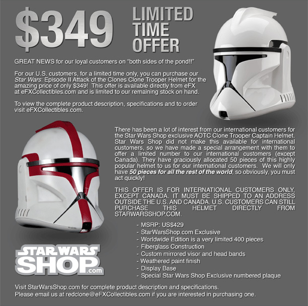 The following message has come in from the Customer Service Manager for eFX Collectibles: We are now offering the AOTC Clone Trooper Captain Helmet (1:1 scale replica) to our international friends. This helmet is a StarWarsShop.com exclusive but they have been gracious enough to let us sell a small amount(50) of their helmets to our international customers. New Zealanders can now order directly from us. If anyone would like to order one, they can send us an email to [email protected].