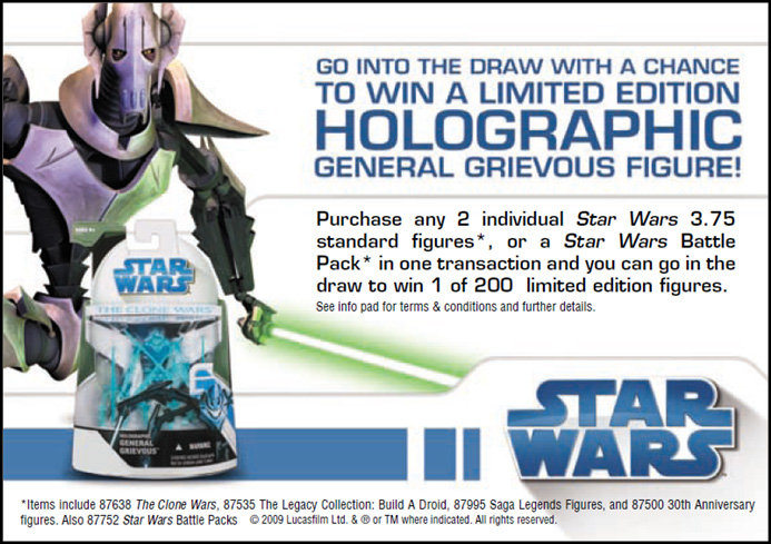 Reminder - this promotion/competition kicks off today: Hasbro NZ is running a Star Wars promotion with Farmers department stores, which starts 1st June and runs for 3 weeks. All you have to do is purchase any 2 Star Wars figures, or a battle pack, pick up an entry form in store, fill it out and post to Hasbro � and you can win 1 of 200 General Grievous limited edition holographic figures.
