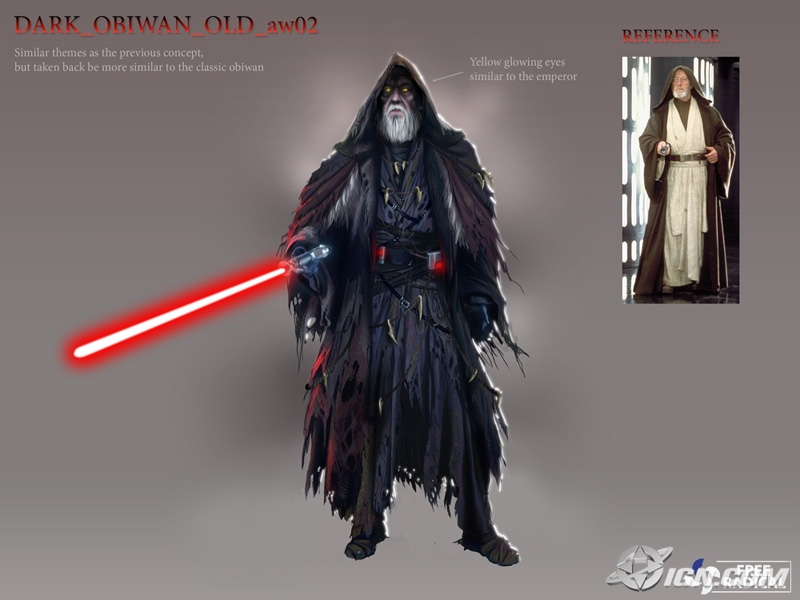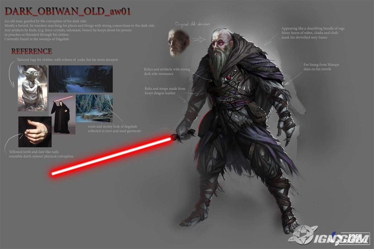 IGN.com is abuzz with new Battlefront III material: Two more leaked pieces of character art made their way onto our desks this morning, and they're likely the most exciting thing we've seen from Star Wars Battlefront III (including the leaked YouTube footage from yesterday). They show a design for someone named Dark Obi-Wan. There's a description in the upper-left of one of the images that reads: "An old man, gnarled by the corruption of the dark side. Mostly a hermit, he wanders searching for places and things with strong connections to the dark side. Any artifacts he finds, (e.g. force crystals, talismans, bones) he keeps about his person in pouches or threaded through his clothes. Currently, found in the swamps of Dagobah."