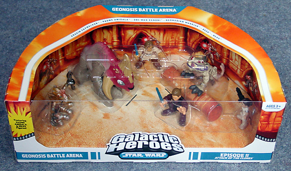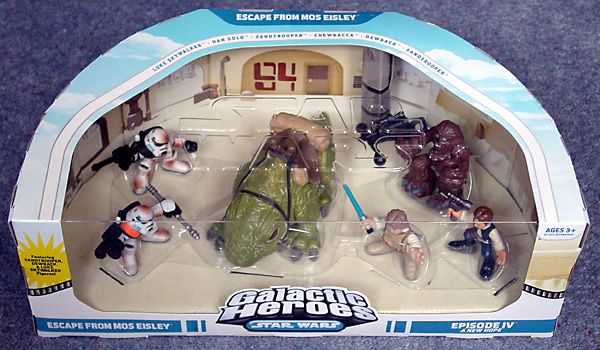 Upstairs in K-Mart there are a few boxes of two new Galactic Heroes diorama sets - "Geonosis Battle Arena" and "Escape From Mos Eisley". None of them have price stickers, but the customer scanner prices them at $14 each!! They also have some Galactic Heroes figures and 3-3/4" figures, but I'm not sure if any are new.