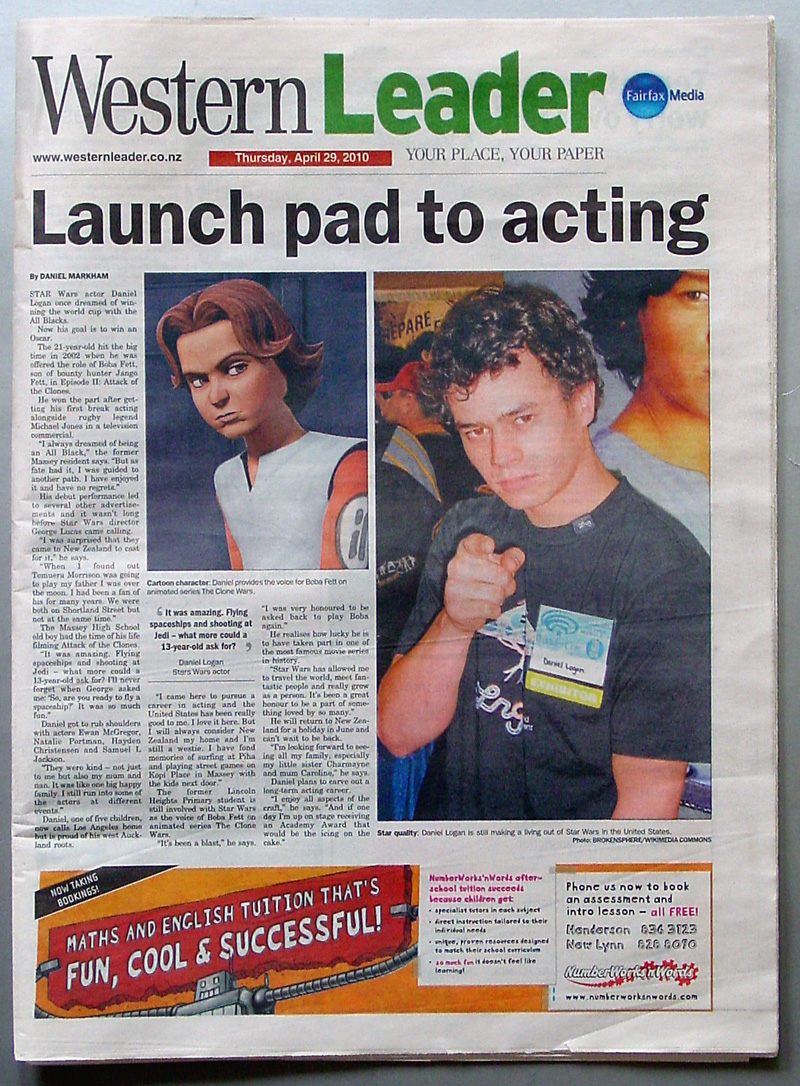 Daniel Logan himself, via his Facebook page, actually bought this to the attention of fans - following up on his recent voice work in The Clone Wars (yet to screen on NZ TV), and an interview in the Star Wars Insider magazine, the local press got an opportunity to put a few questions to him. In the Western Leader newspaper - a regional publication from Daniel's hometown - he talks about his aspirations, his involvement in Star Wars and The Clone Wars, and recollections of growing up in New Zealand. "Daniel, one of five children, now calls Los Angeles home but is proud of his west Auckland roots. 'I came here to pursue a career in acting and the United States has been really good to me. I love it here. But I will always consider New Zealand my home and I'm still a westie. I have fond memories of surfing at Piha and playing street games on Kopi Place in Massey with the kids next door.'"