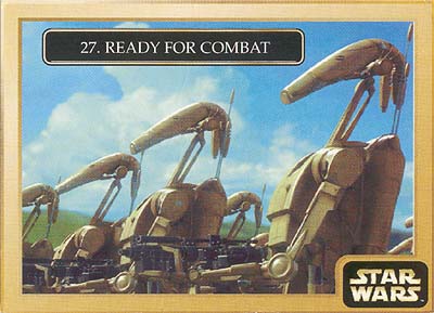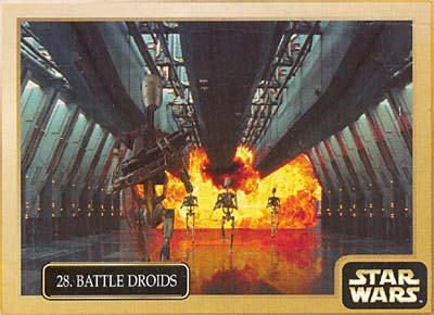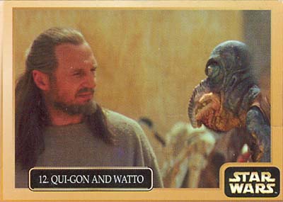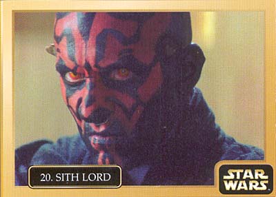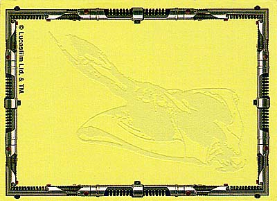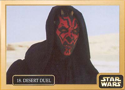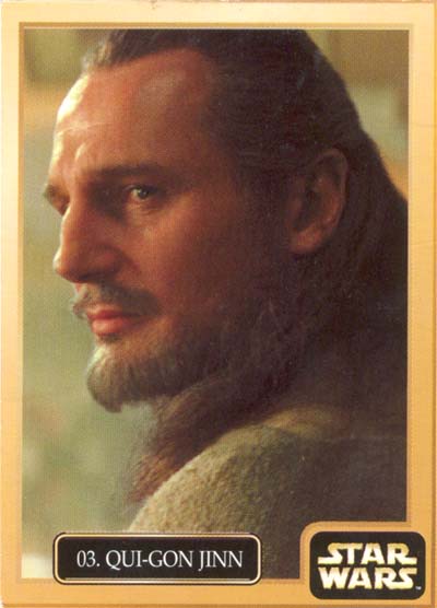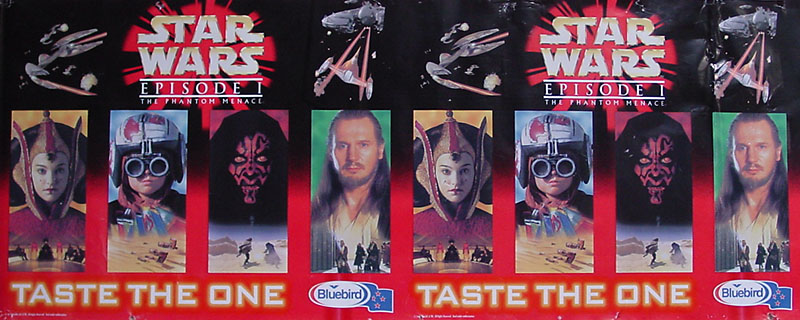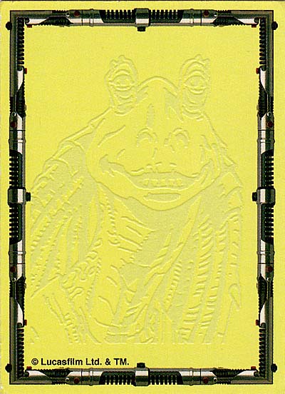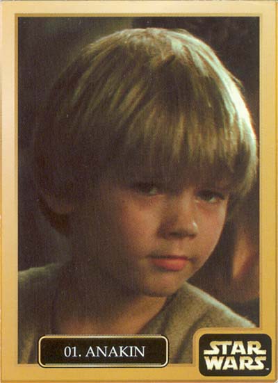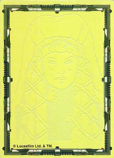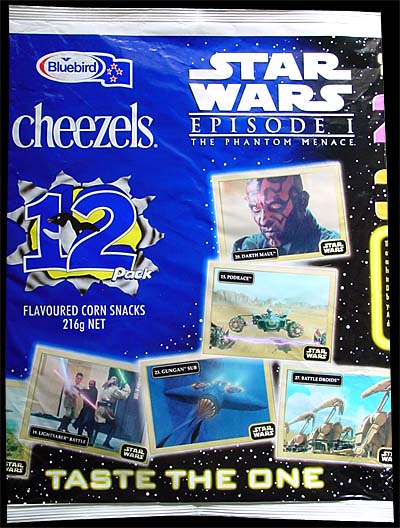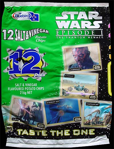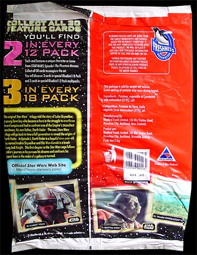 The images below are samples of the 12-pack bags. As well as being emblazoned with larger-than-life representations of the collectible cards, the packaging references the Official Star Wars website, and summarises the mythos and the detail of the Star Wars saga: "The original Star Wars trilogy told the story of Luke Skywalker, a young farm boy who became a hero in the struggleto overthrow an evil empire, and had to confront one of the Empire's staunchest henchman, his own father, Darth Vader. The new Star Wars trilogy will go back in time a full generation to reveal the origins of Darth Vader. In Episode 1, Darth Vader is a hopeful nine-year-old boy named Anakin Skywalker, and Obi-Wan Kenobi is a brash young Jedi Knight. This first chapter in the Star Wars saga follows Anakin's journey as he pursues his dreams and confronts his deepest fears in the midst of a galaxy in turmoil".