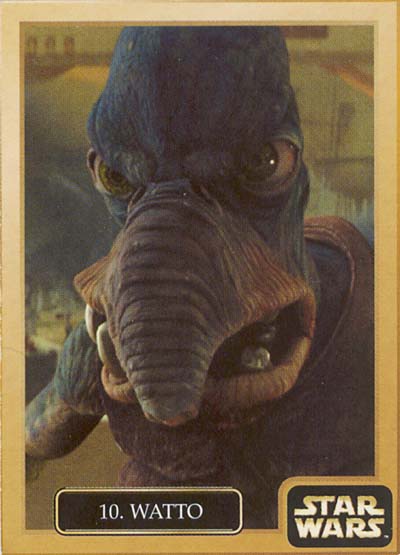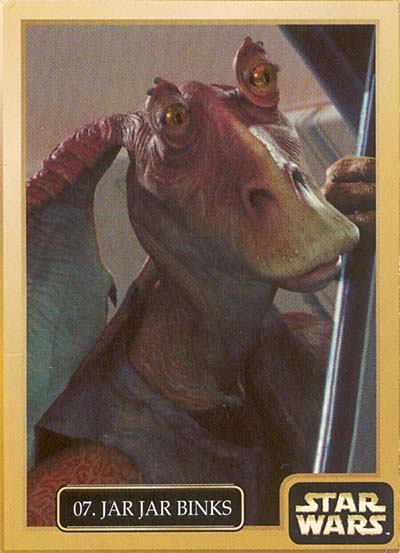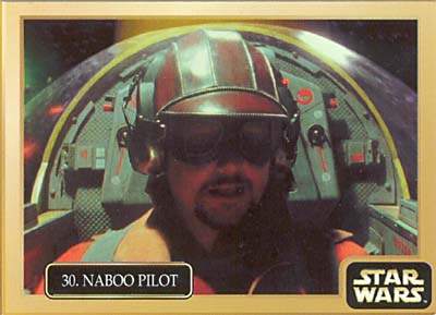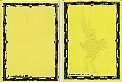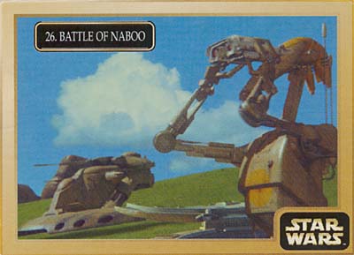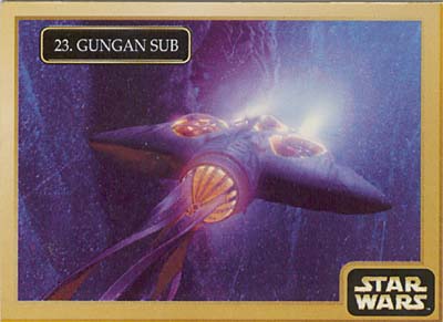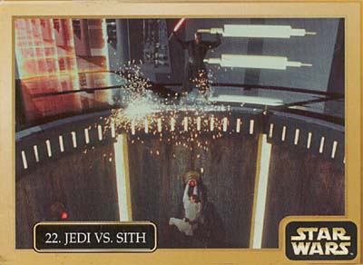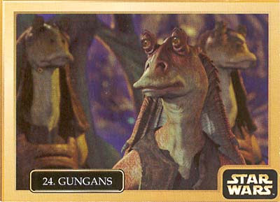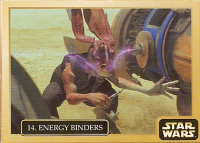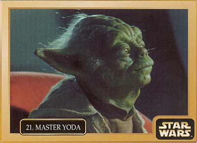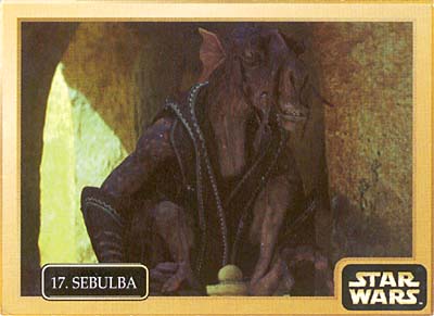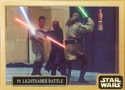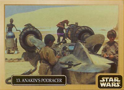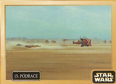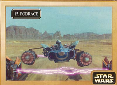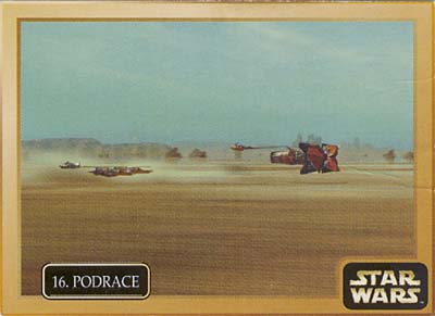As well as the basic set, a couple of variation cards have been found. The most well known is the number 15 error card, that has the image and caption from card 16 but is declared as card '15' (cards 15 and 16 both have the same simple caption, 'Podrace', but on the real card 15 it is on the top left, and on the real card 16, on the bottom left). Click here for image. And for the completist, there exist variations wherein the glow-in-the-dark image from the back of the card is entirely missing. For example, click here to view both versions of the back of card 24.