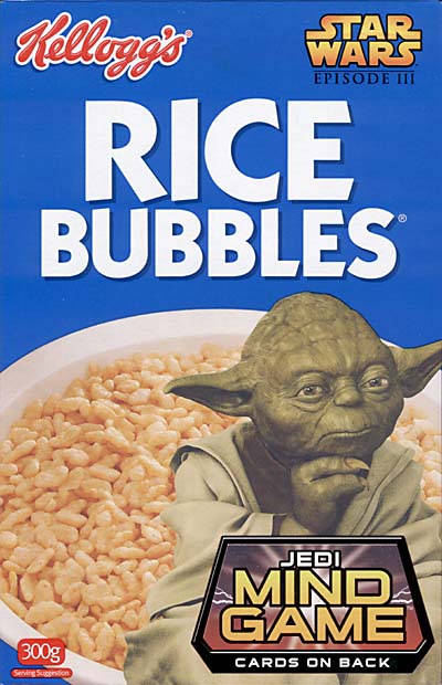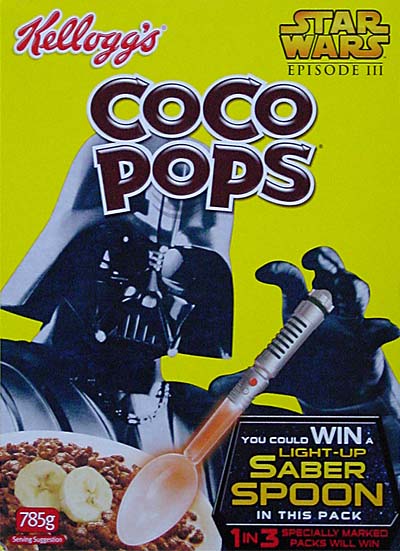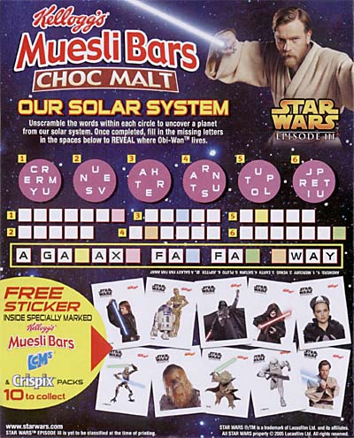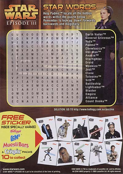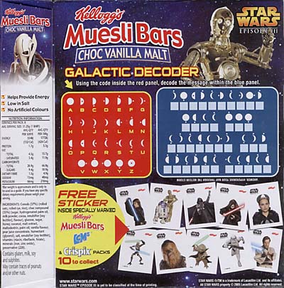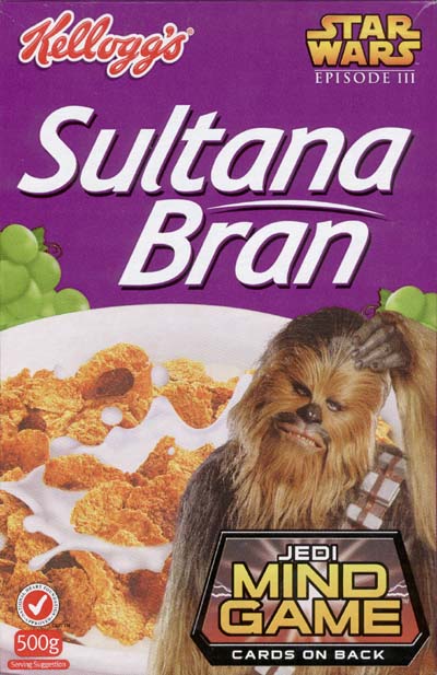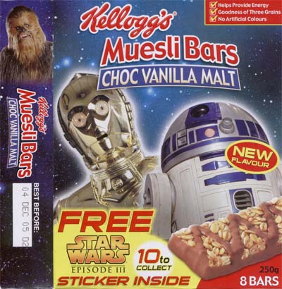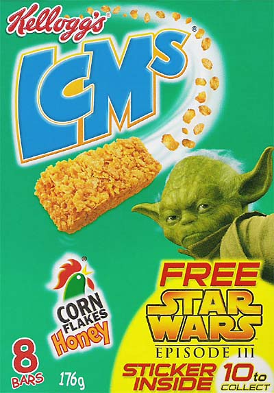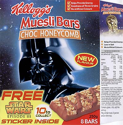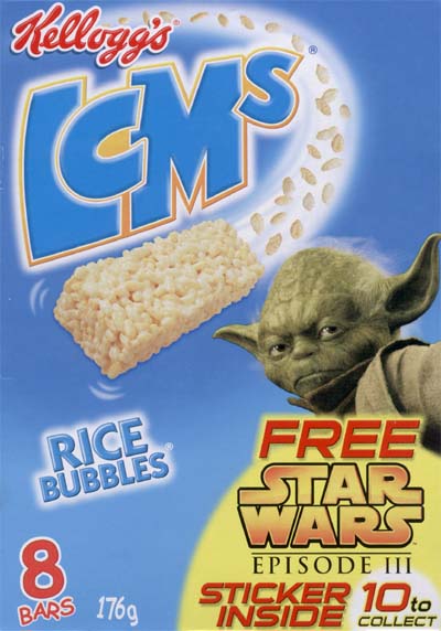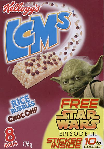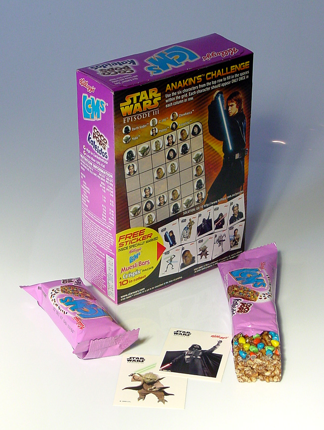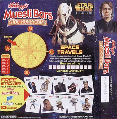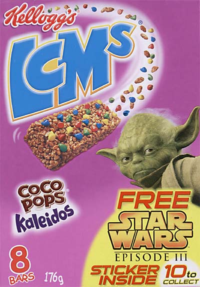 The Kellogg company has a longstanding, international relationship with the Star Wars genre. In New Zealand, this dates back to their 'Return of the Jedi' promotional stickers and competition. In 2005, associated with the release of Episode 3: Revenge of the Sith, the Kellogg's Star Wars branded product and included collectibles are so numerous, it pays to take a systematic approach in order to get a comprehensive overview. 11 different cereal packages were released - they progressively made there way on to supermarket shelved over a period of a number of weeks: 415g Mini-Wheats, 2 sizes of Sultana Bran (500g and 880g), 2 sizes of Coco Pops (450g and 785g), 430g Frosties, 2 flavours of Crispix (340g cocoa flavour, and 310g honey flavour), 340g Froot Loops, and 2 sizes of Rice Bubbles (300g and 530g). 7 of the 11 cereal boxes had a collection of cut-out Jedi Mind Game cards on the back; the exceptions were the largest sizes of Rice Bubbles and Sultana Bran, which each had a 1 in 3 chance of finding a battery operated "lightsaber spoon" packaged inside, and Crispix, the two flavours of which contained collectible stickers. The remainder of the collectible stickers, portraying Episode 3 characters on a clean, white background (all from standard promotional images) could be found in boxes of Muesli bars (Choc Malt, Choc Vanilla Malt, and Choc Honeycomb) and LCM bars (Coco Pops Kaleidos, Rice Bubbles Choc Chip, Rice Bubbles, and Corn Flakes Honey). All of the sticker-bearing products also have, on the rear of their packaging, a puzzle, game, or Star Wars-related brain-teaser.