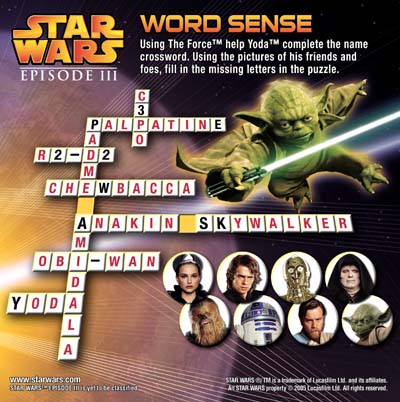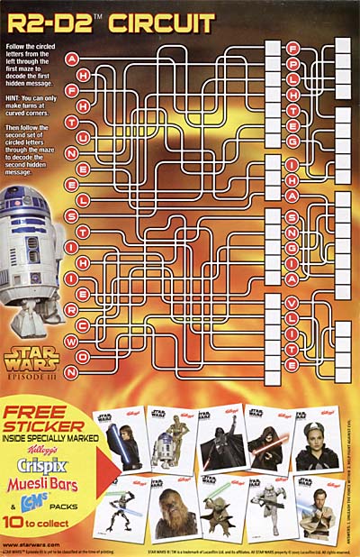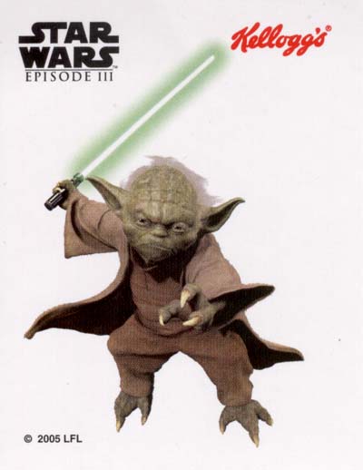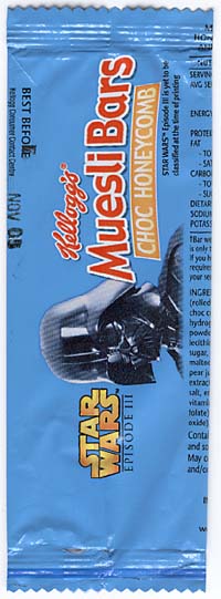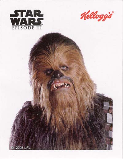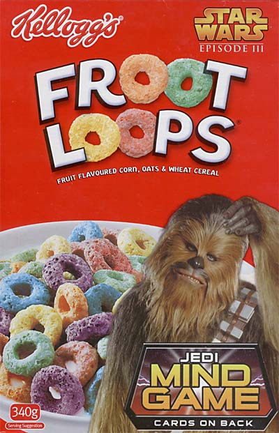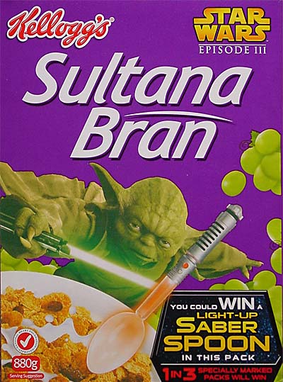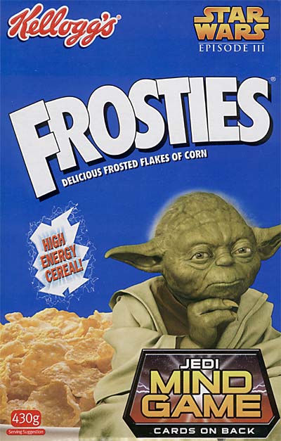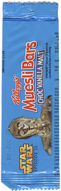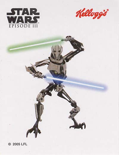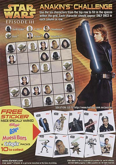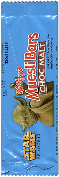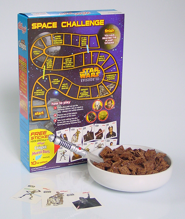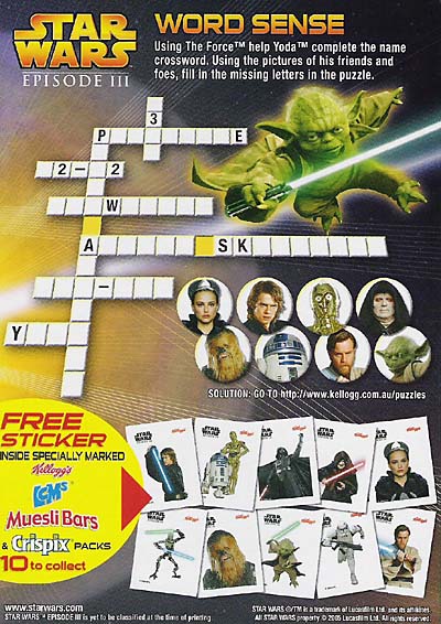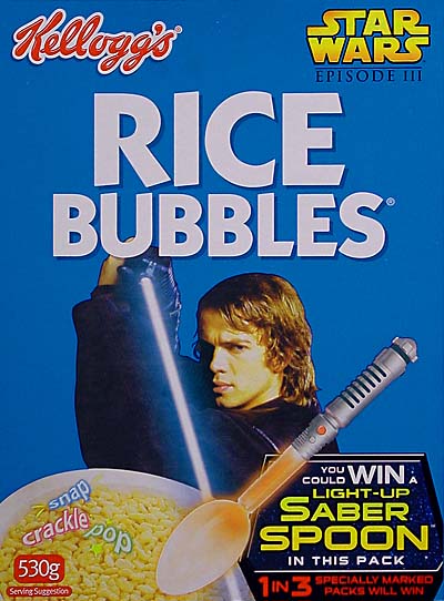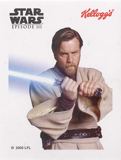 The Kellogg company has a longstanding, international relationship with the Star Wars genre. In New Zealand, this dates back to their 'Return of the Jedi' promotional stickers and competition. In 2005, associated with the release of Episode 3: Revenge of the Sith, the Kellogg's Star Wars branded product and included collectibles are so numerous, it pays to take a systematic approach in order to get a comprehensive overview. 11 different cereal packages were released - they progressively made there way on to supermarket shelved over a period of a number of weeks: 415g Mini-Wheats, 2 sizes of Sultana Bran (500g and 880g), 2 sizes of Coco Pops (450g and 785g), 430g Frosties, 2 flavours of Crispix (340g cocoa flavour, and 310g honey flavour), 340g Froot Loops, and 2 sizes of Rice Bubbles (300g and 530g). 7 of the 11 cereal boxes had a collection of cut-out Jedi Mind Game cards on the back; the exceptions were the largest sizes of Rice Bubbles and Sultana Bran, which each had a 1 in 3 chance of finding a battery operated "lightsaber spoon" packaged inside, and Crispix, the two flavours of which contained collectible stickers. The remainder of the collectible stickers, portraying Episode 3 characters on a clean, white background (all from standard promotional images) could be found in boxes of Muesli bars (Choc Malt, Choc Vanilla Malt, and Choc Honeycomb) and LCM bars (Coco Pops Kaleidos, Rice Bubbles Choc Chip, Rice Bubbles, and Corn Flakes Honey). All of the sticker-bearing products also have, on the rear of their packaging, a puzzle, game, or Star Wars-related brain-teaser.