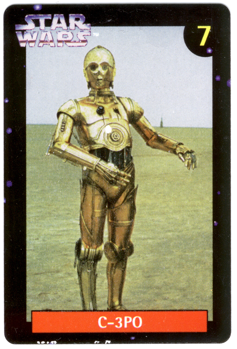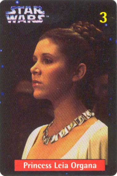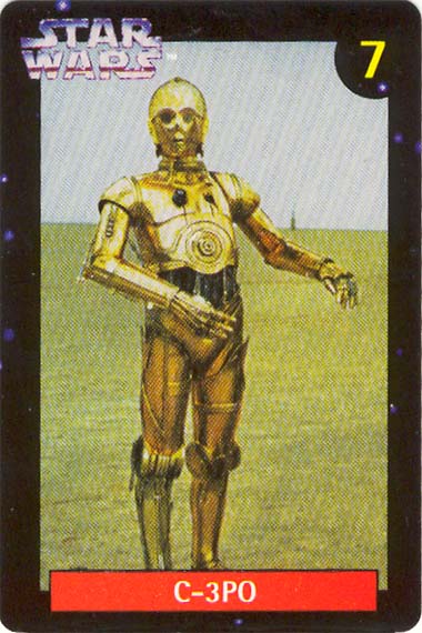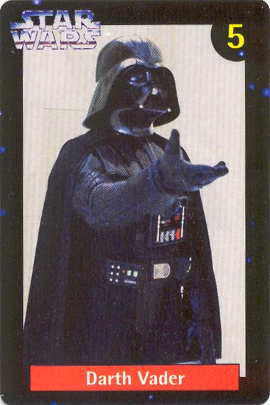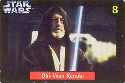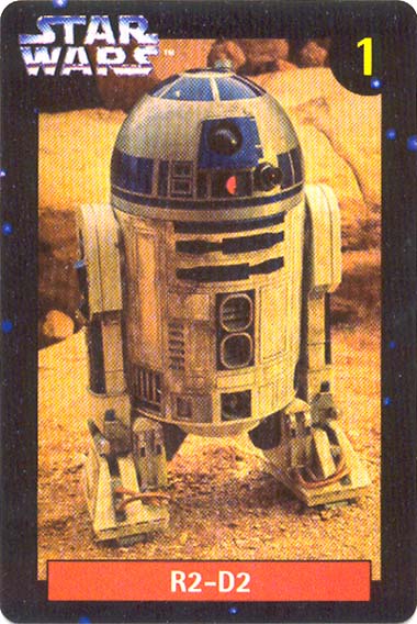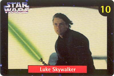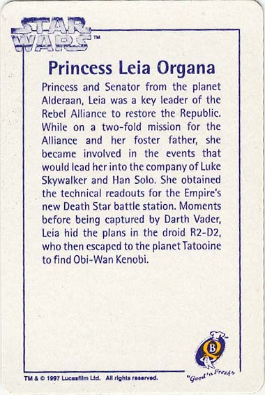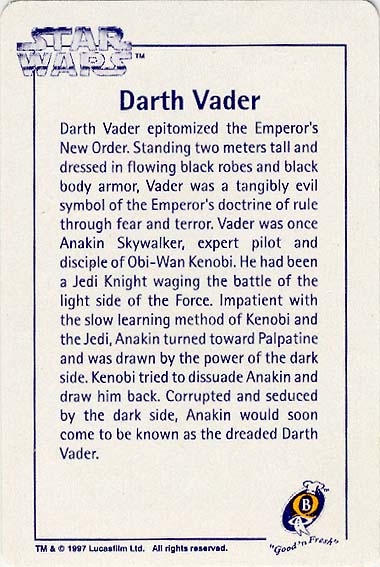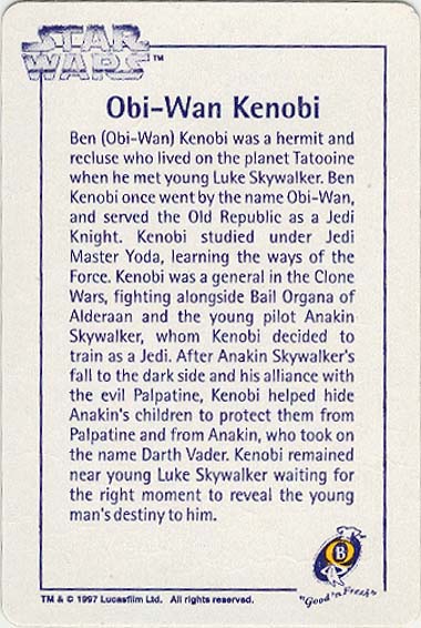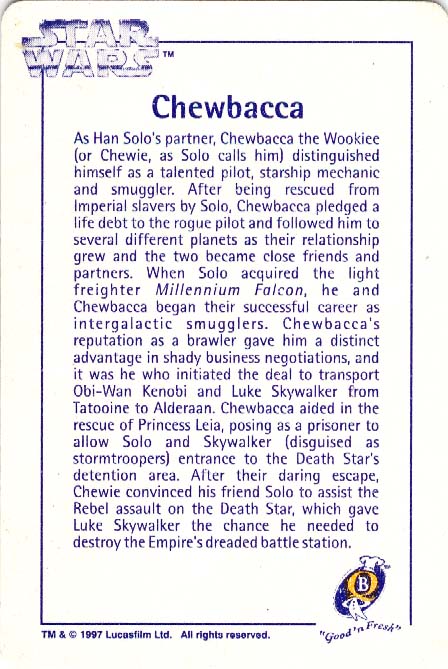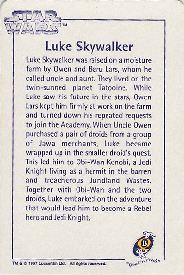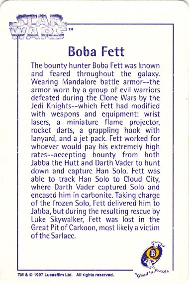 Ten numbered cards (of a fairly standard size: 57 x 85mm) depict our favourite heroes, and a couple of equally renown anti-heroes, from classic movie scenes and publicity shots. Made from fairly lightweight cardstock, they have a tendency to curl if not stored pressed in some way. The fronts were printed with a glossy, full-colour finish. The back of the cards (printed in a monochrome blue, save for a splash of yellow in the Quality Bakers logo) recall the stories (including both on-screen, and 'Expanded Universe' details) behind their associated character; some in very elaborate detail. Says Boba Fett's card, for instance, "Wearing Mandalore battle armor -- the armor worn by a group of evil warriors defeated during the Clone Wars by the Jedi Knights -- which Fett had modified with weapons and equipment". The American spelling, which is quoted verbatim, suggests this descriptive prose had its origins outside of New Zealand.