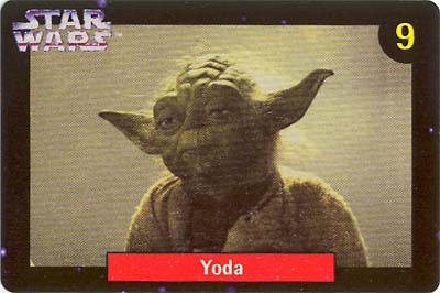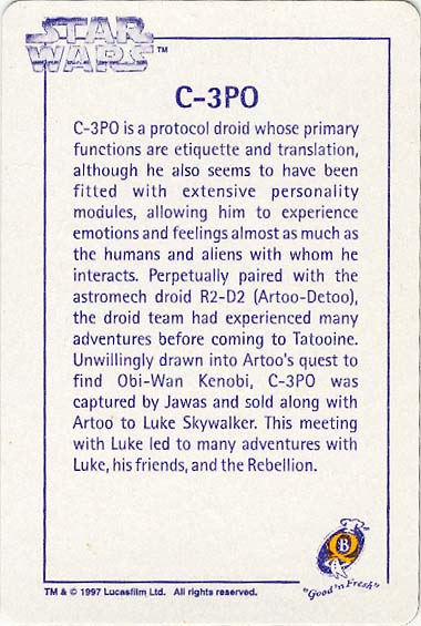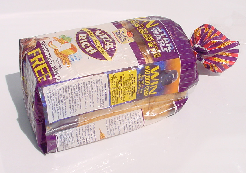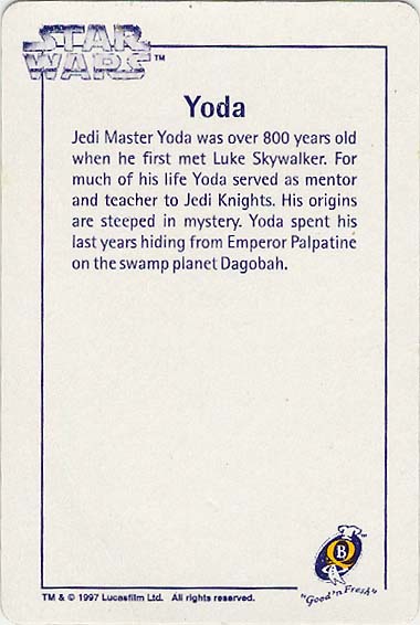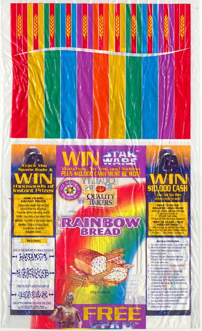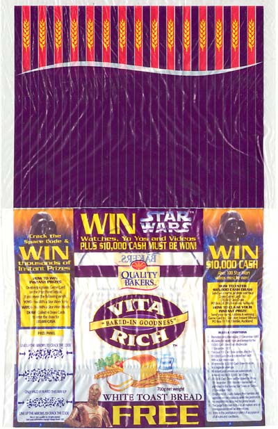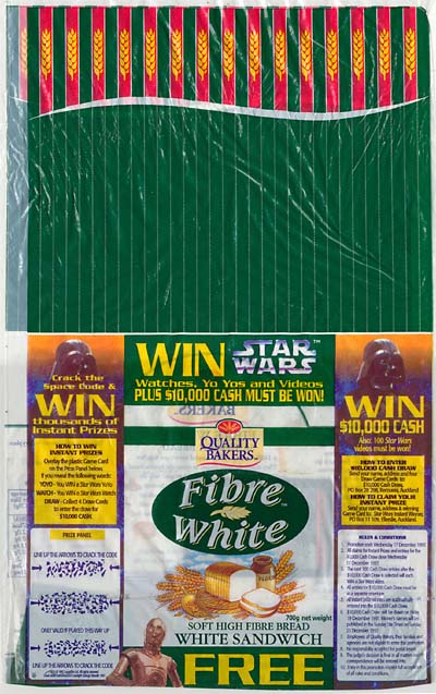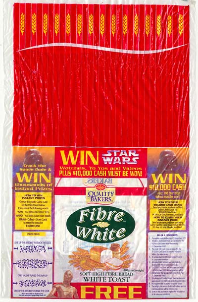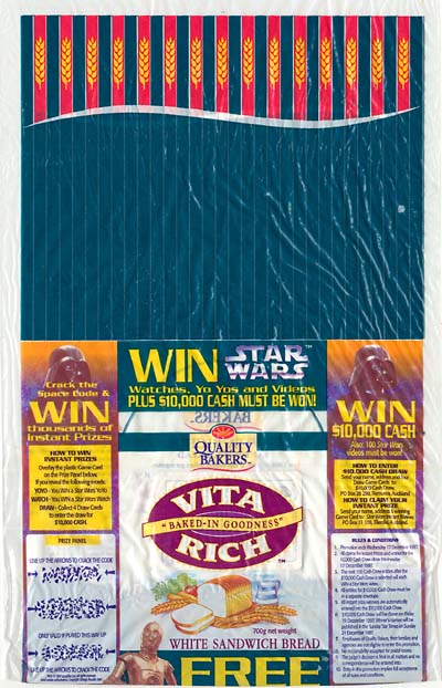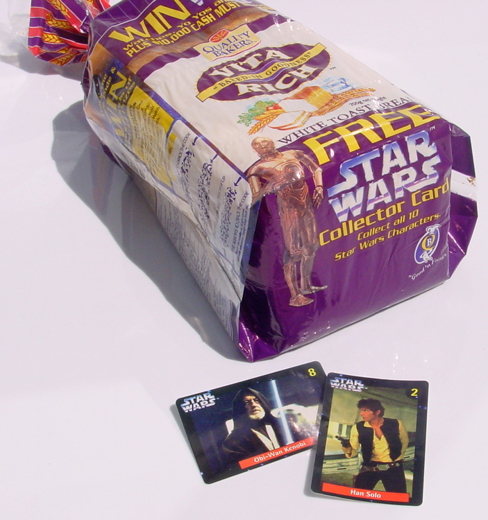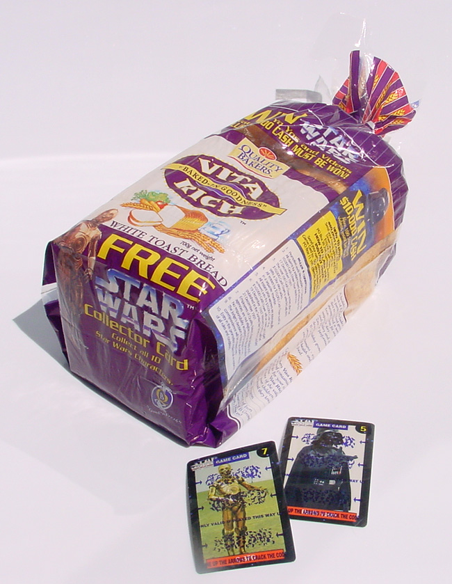 Here's some Star Wars memorabilia offered with another staple food item: the Quality Bakers bread cards. This set of collectible cards came out in 1997, in conjunction with a promotion and competition that coincided with the availability of the Original Trilogy on VHS. Indeed, Star Wars videos were amongst the prizes, as were lesser, but instant, awards of watches and yo-yos. The competition was topped with a $10,000 cash draw.