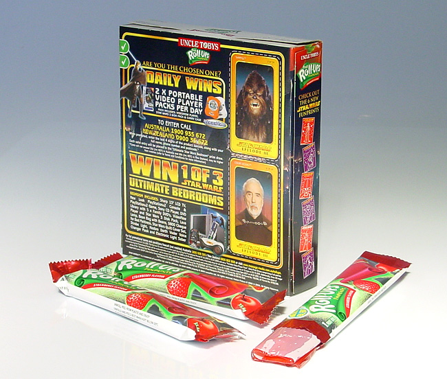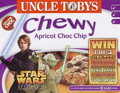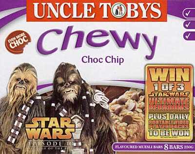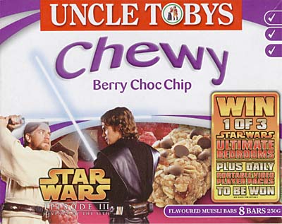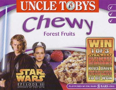 The five different muesli bar flavours each have boxes featuring different artwork/characters. A mildly disappointing aspect of much Episode 3 licensed material is that it features graphics from a very limited library of promotional images - all posed photos with plain backgrounds, rather than the on-set photos of old. Despite this, the Uncle Tobys packaging has managed to incorporate the character shots and branding into its standard product livery, to good effect. The back of the muesli bar boxes are all the same, describing the competition run in conjunction with these cereal bars - "Win one of 3 ultimate Star Wars bedrooms" consisting of LCD TV, Playstation 2 console and games, CD player, DVD library, Star Wars bedclothes, Vader voice changers, lightsaber and more.